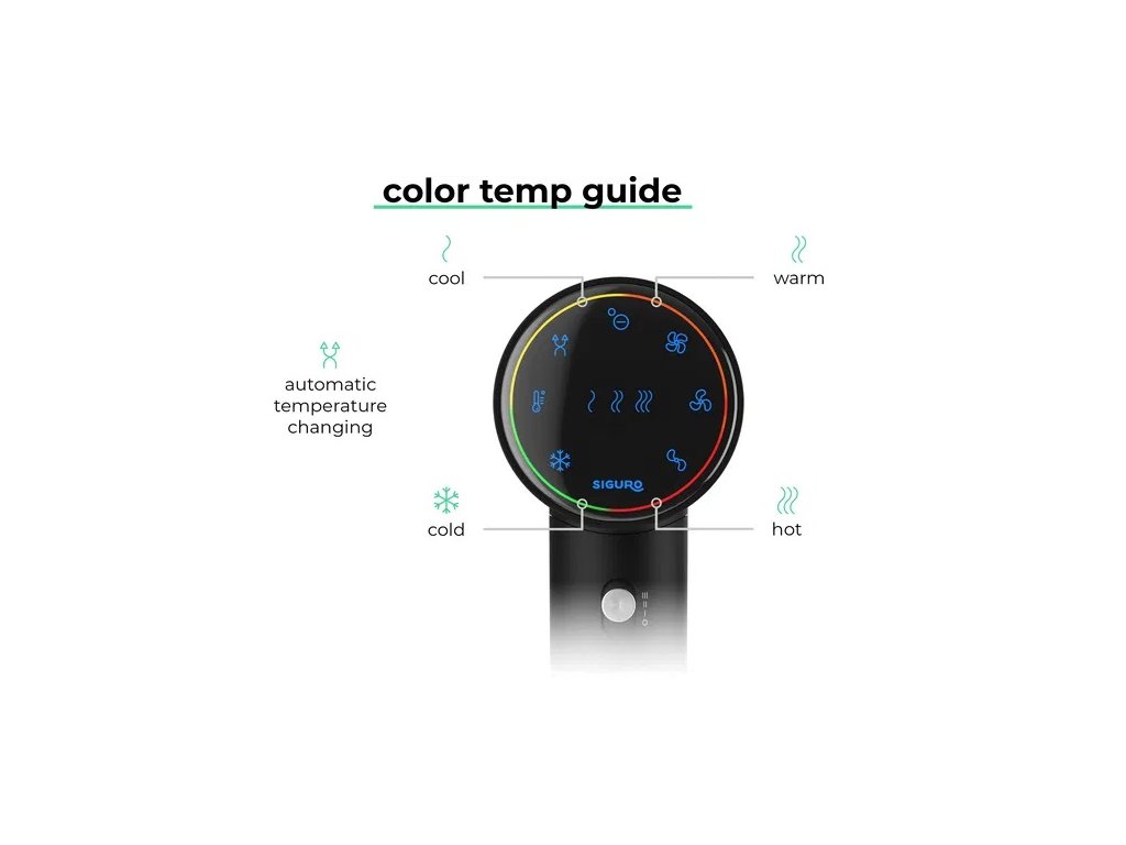 S fénem na vlasy Siguro I450B Twilight Flow budete mít na výběr z celkem čtyř teplot. Výkon fénu si tak můžete přizpůsobit typu svých vlasů a zajistit si vždy rychlé a stoprocentní výsledky. Pomocí stisku tlačítka na rukojeti vybere nízkou, střední, vysokou teplotu nebo studený vzduch pro závěrečnou fixaci účesu. K dispozici je i režim střídání teplého a studeného vzduchu. Vybraná teplota je barevně znázorněna na kruhovém ukazateli pro obvodu displeje.