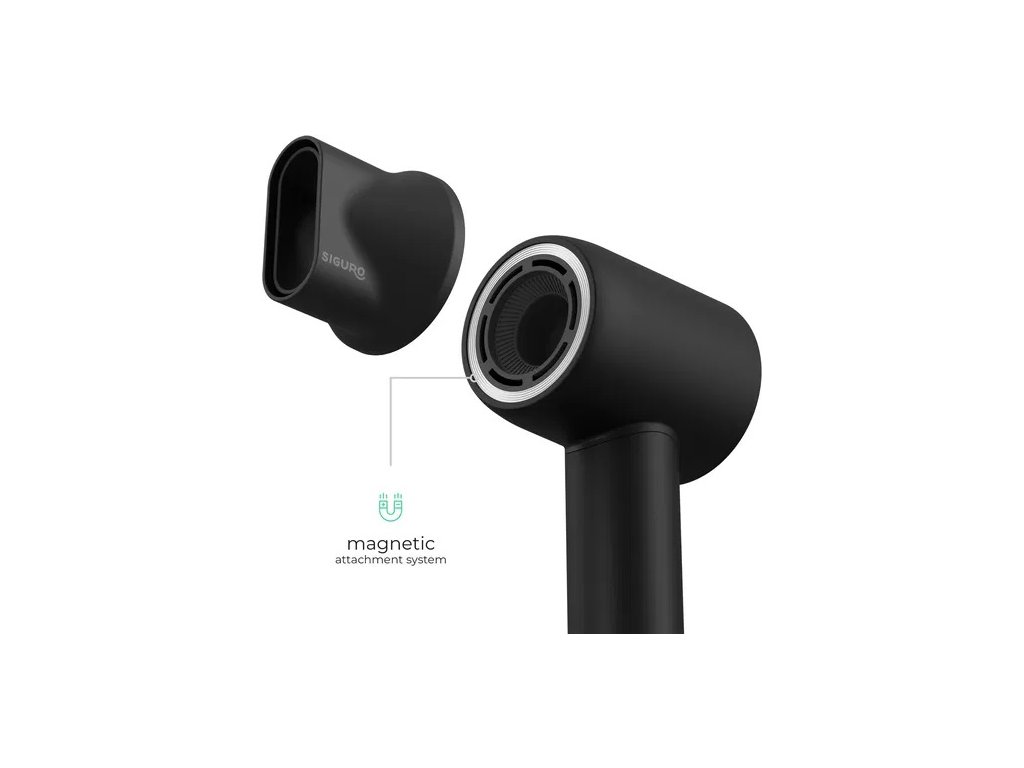 Součástí balení je koncentrátor sloužící k vysušení a vytvarování jednotlivých pramenů vlasů. K fénu Siguro I450B Twilight Flow se připevňuje pomocí magnetu, který zajišťuje snadné nasazení a odstranění. Koncentrátor je otočný o 360°, proto jej budete moci pohodlně nastavit do požadovaného úhlu.