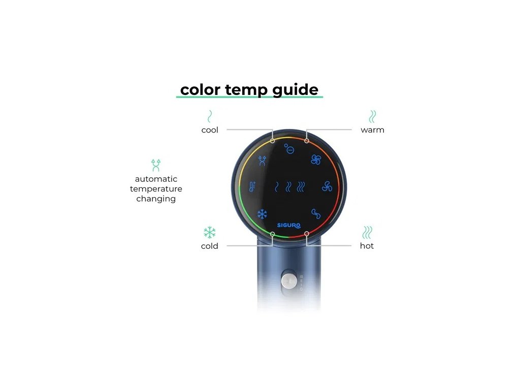 S fénem na vlasy Siguro HR-I450D Ocean Flow budete mít na výběr z celkem čtyř teplot. Výkon fénu si tak můžete přizpůsobit typu svých vlasů a zajistit si vždy rychlé a stoprocentní výsledky. Pomocí stisku tlačítka na rukojeti vybere nízkou, střední, vysokou teplotu nebo studený vzduch pro závěrečnou fixaci účesu. K dispozici je i režim střídání teplého a studeného vzduchu. Vybraná teplota je barevně znázorněna na kruhovém ukazateli pro obvodu displeje.