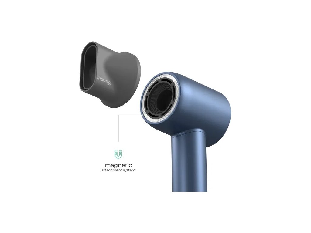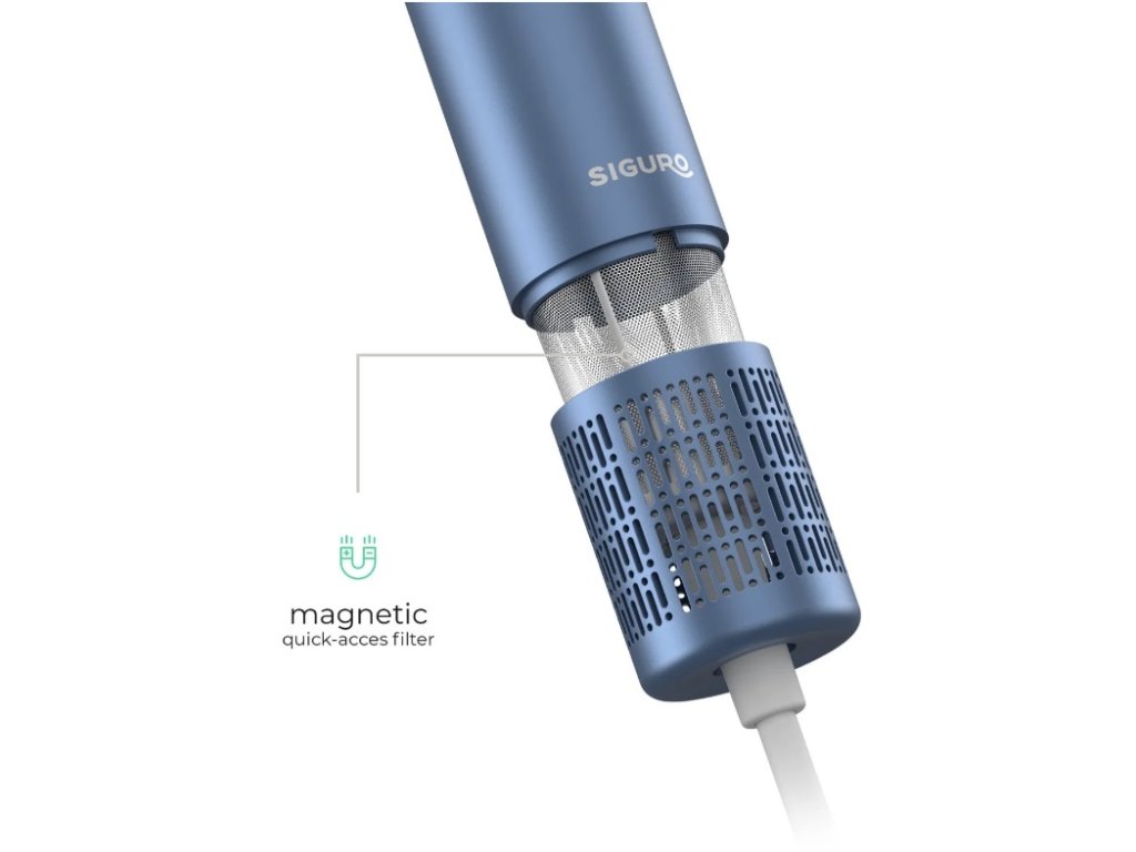 Součástí balení je koncentrátor sloužící k vysušení a vytvarování jednotlivých pramenů vlasů. K fénu Siguro HR-I450D Ocean Flow se připevňuje pomocí magnetu, který zajišťuje snadné nasazení a odstranění. Koncentrátor je otočný o 360°, proto jej budete moci pohodlně nastavit do požadovaného úhlu.